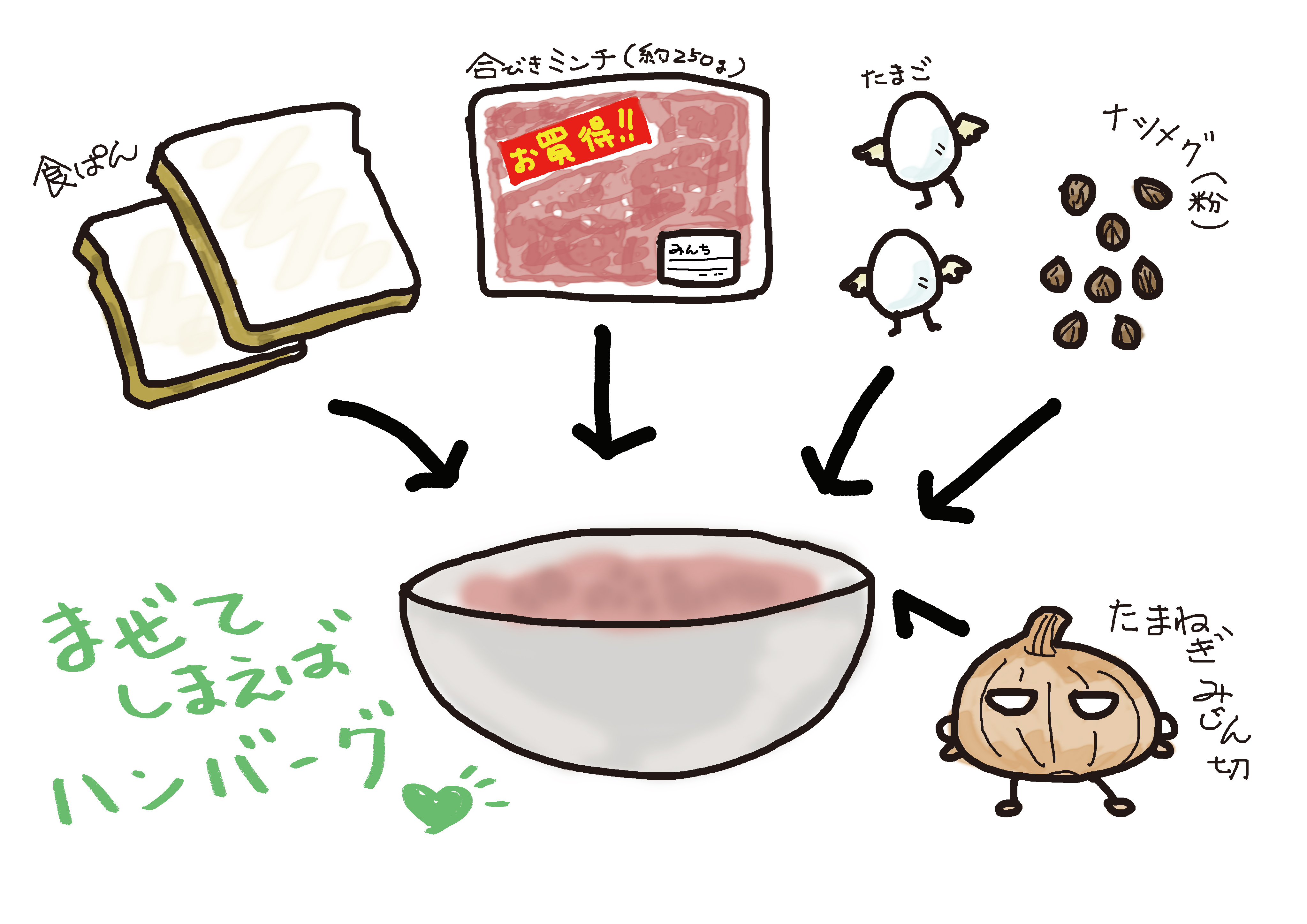ナツメグは、ニクズク科の常緑高木の一種。またはその種子中の仁から作られる香辛料。ナッツメッグ、ナットメグとも。和名はニクズクという。 蘊蓄たれてますが、最近では100均でも売ってるのでハウスやSBの小売のパウダーで十分です。これを思いっきり入れないとこのパンバーグは食パン風味から抜け出せません。