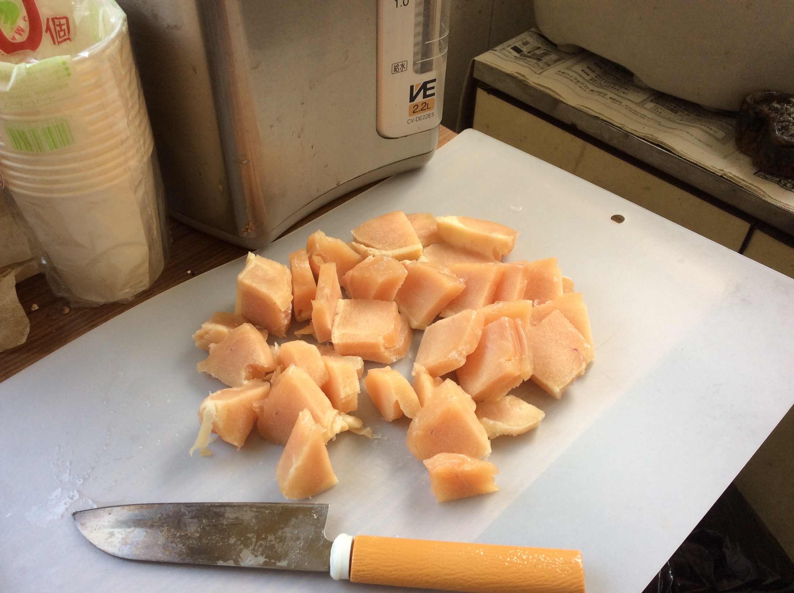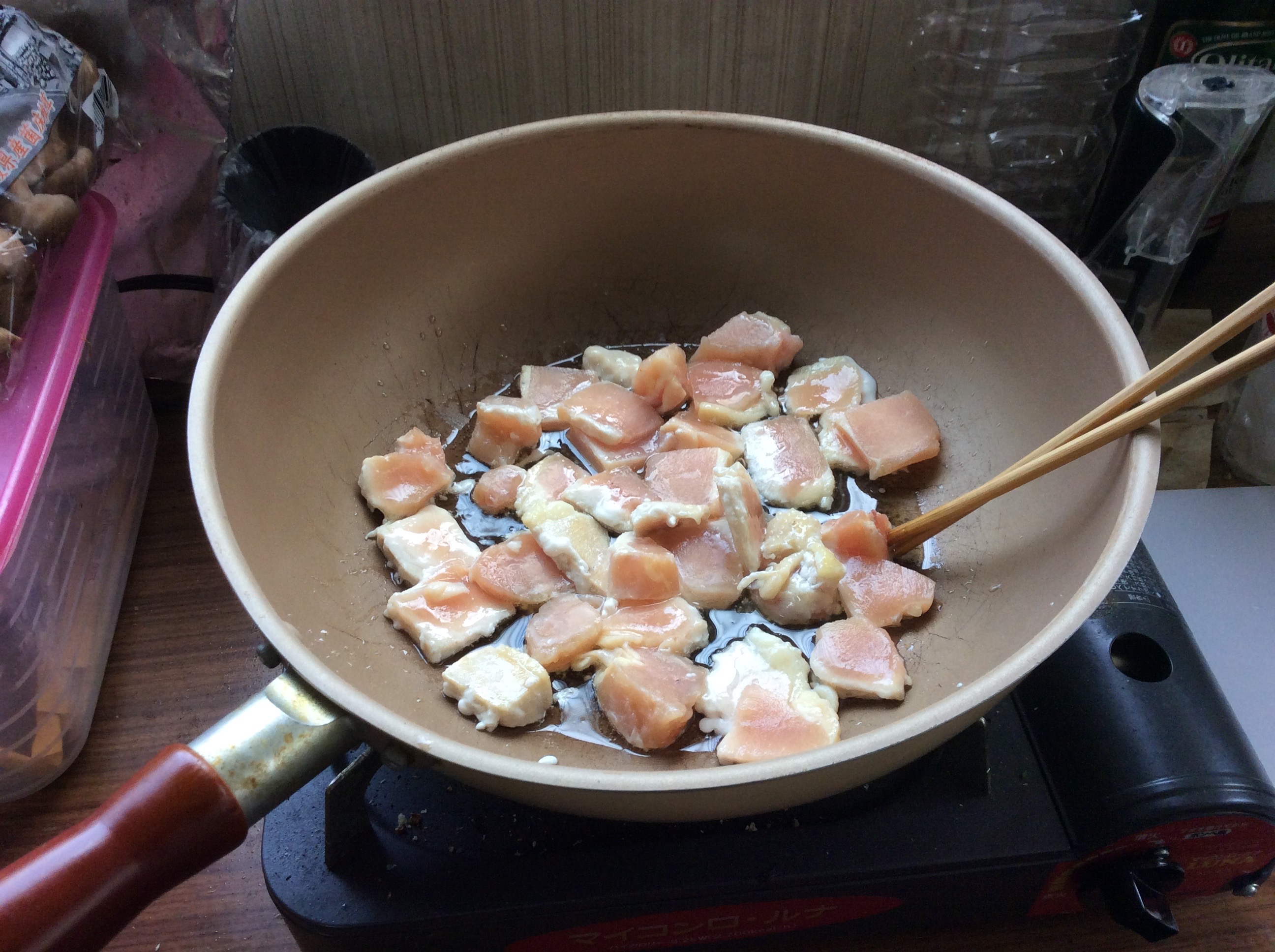 フライパンに多めに油を入れ、鶏肉を炒める。