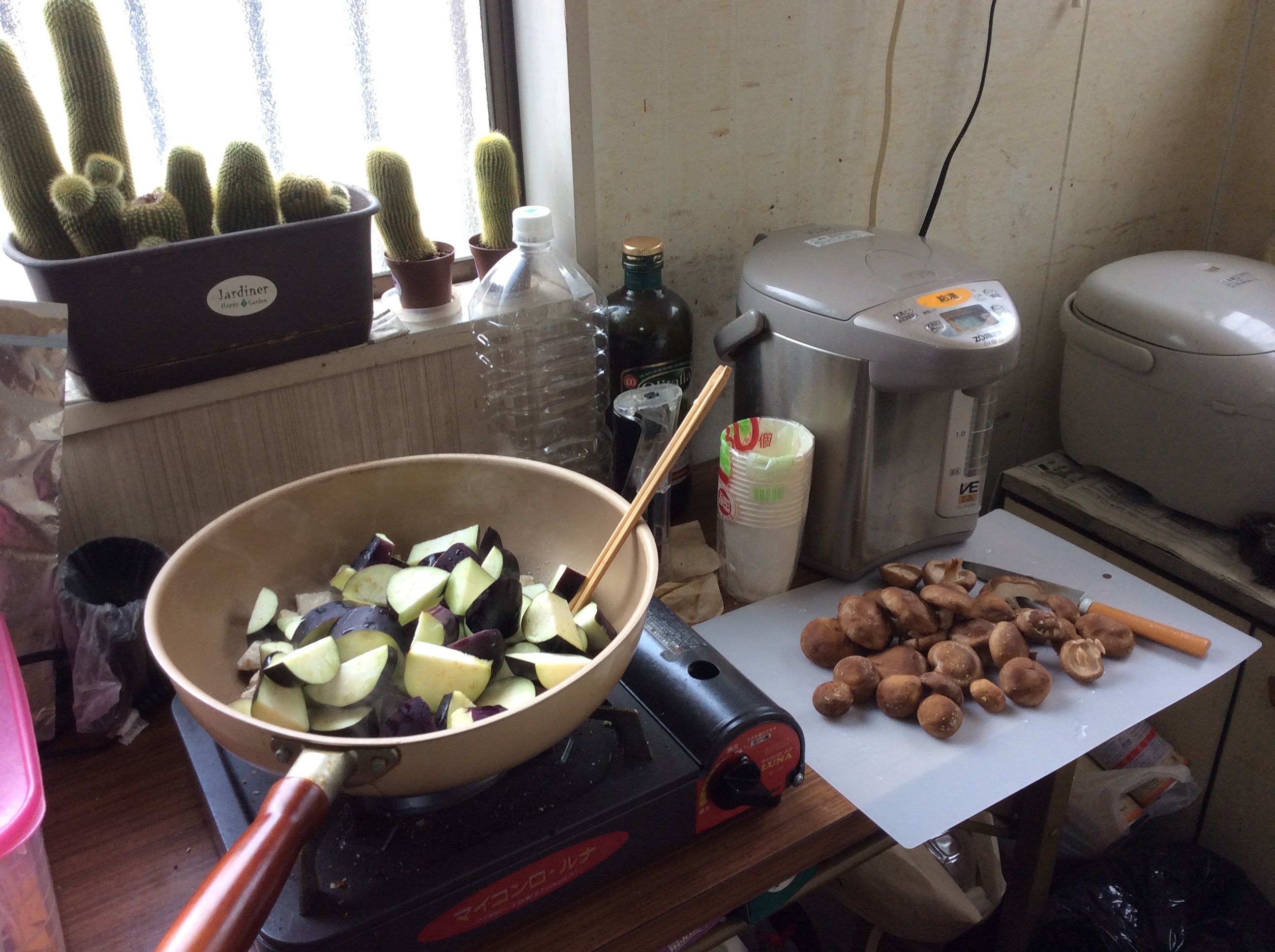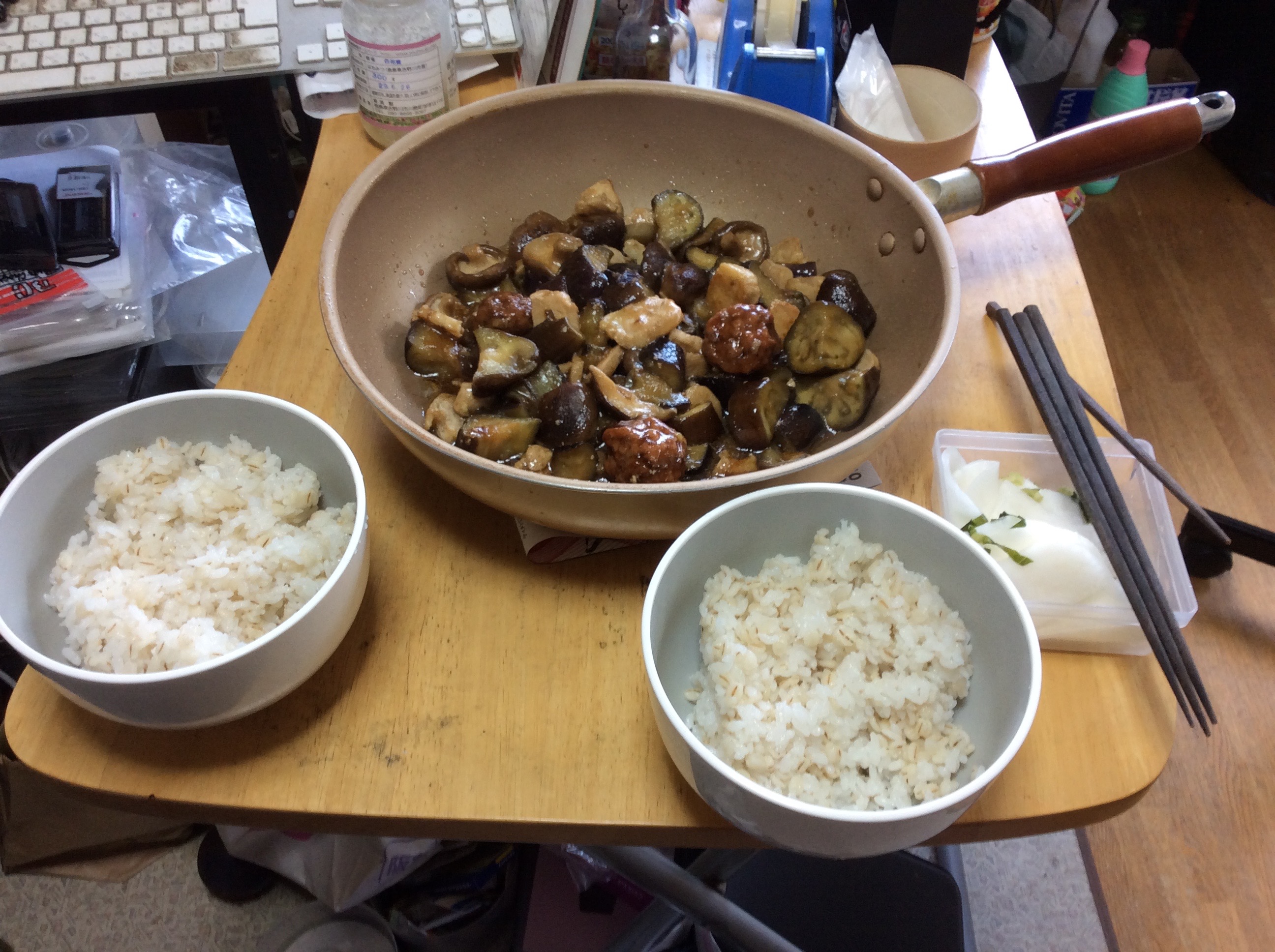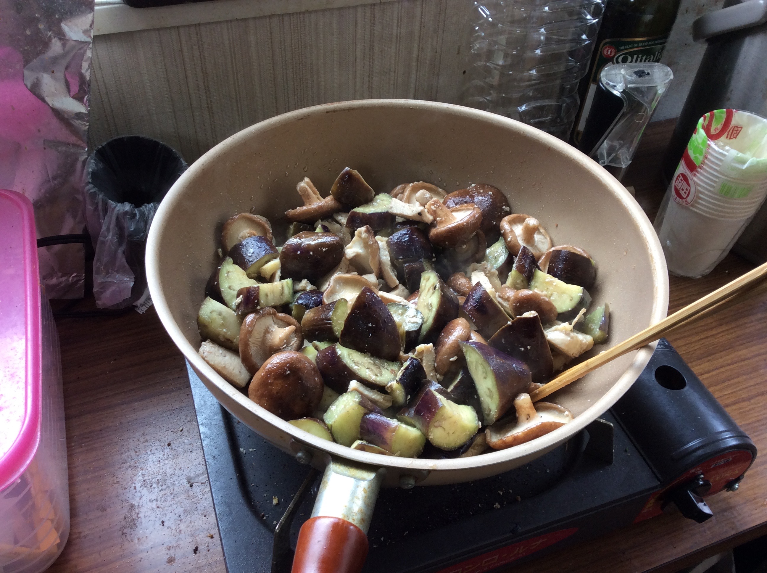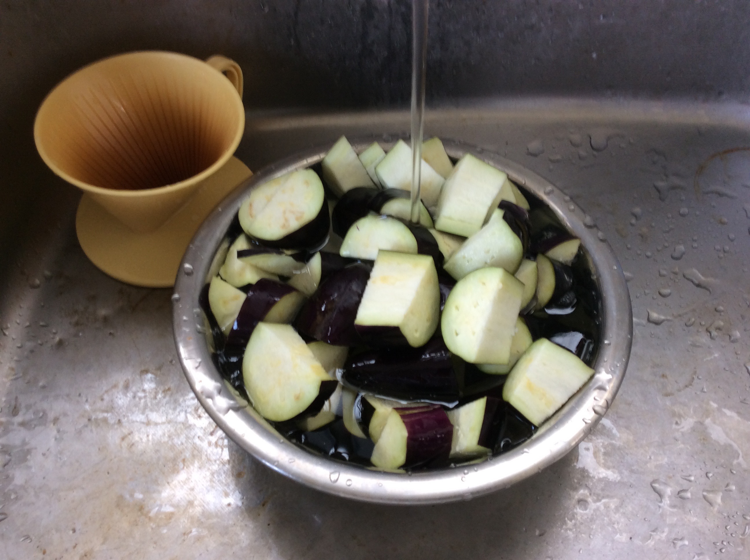 ぼちぼち、鶏肉に火が通っている頃なので、まずナスから投入。