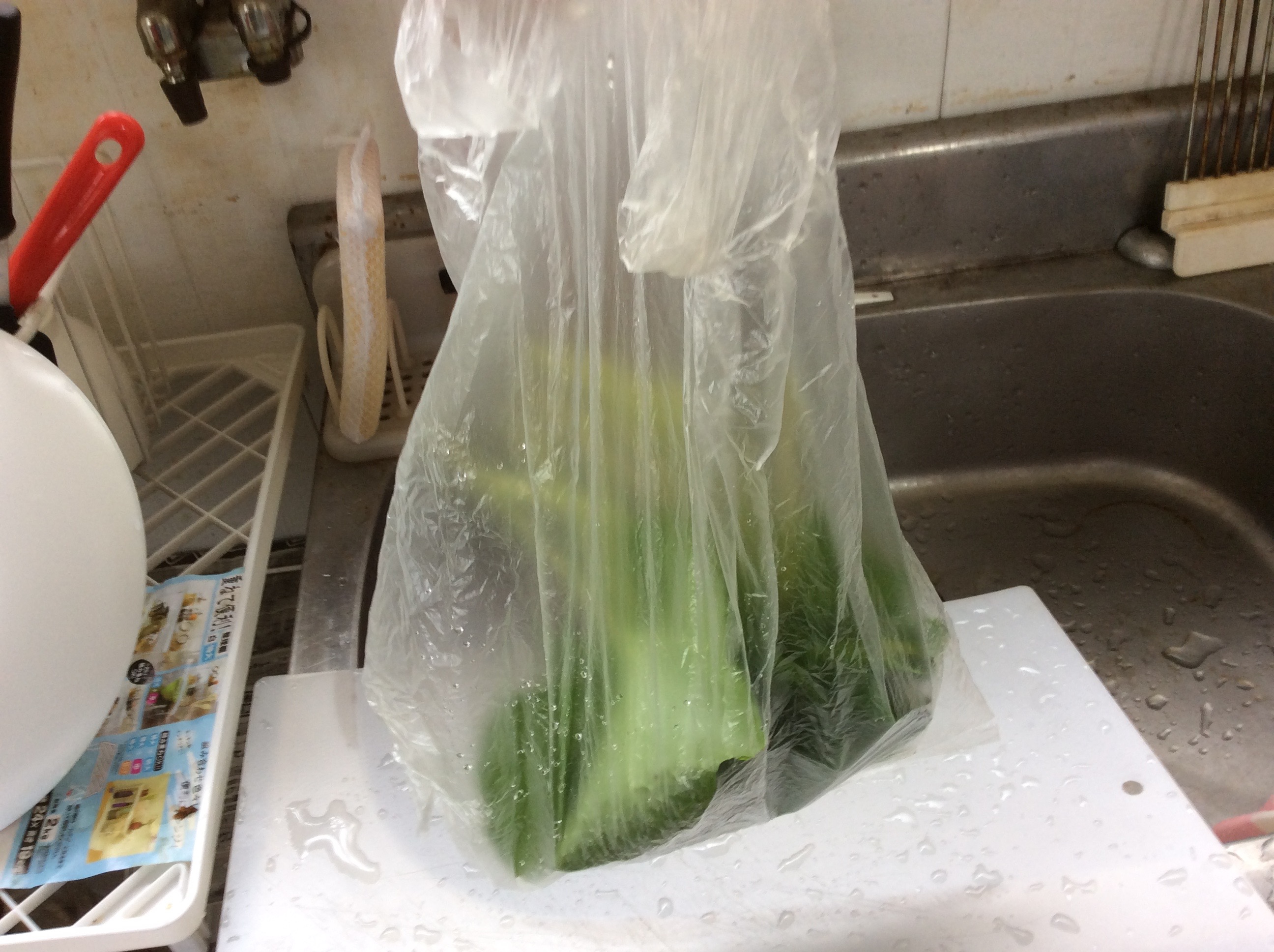 別にビニールに入れなくてもまな板の上で塩もみにしてもいいです。