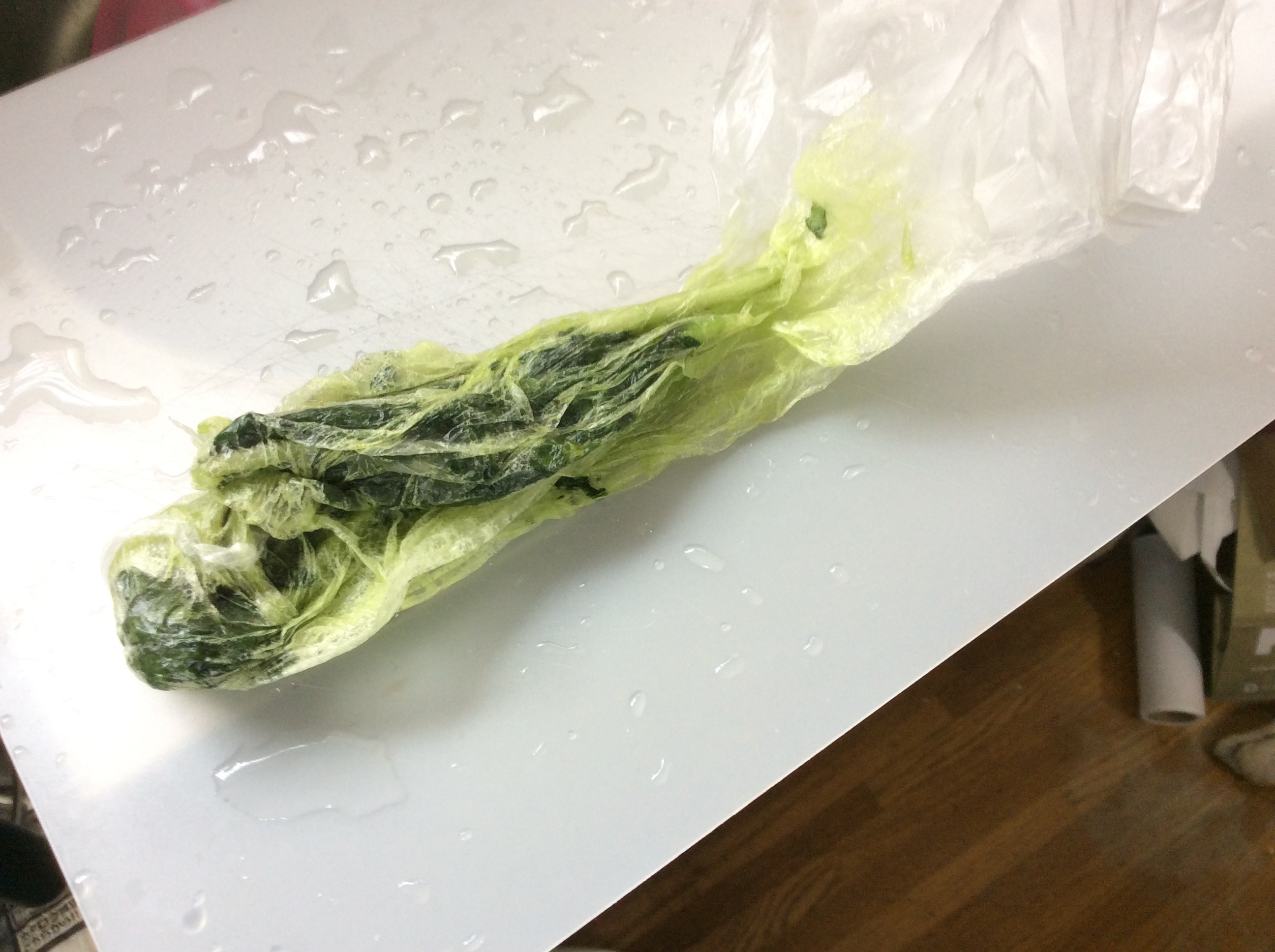 ビニールに入れて塩で揉み倒す。葉物野菜にかけるには強めの力で