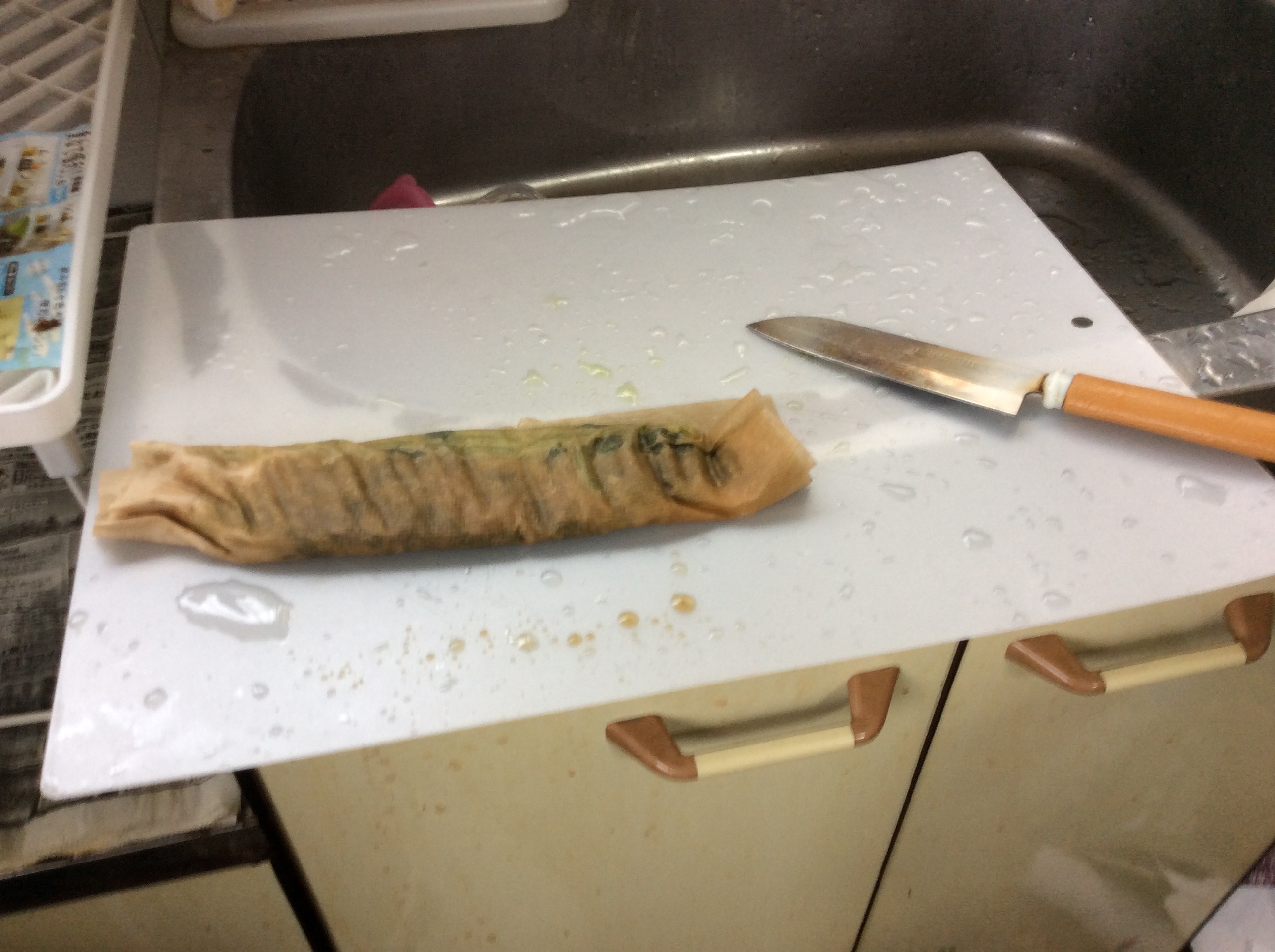 揉み終わったらキッチンペーパーで包んで、包丁の背などでひたすら叩きます。