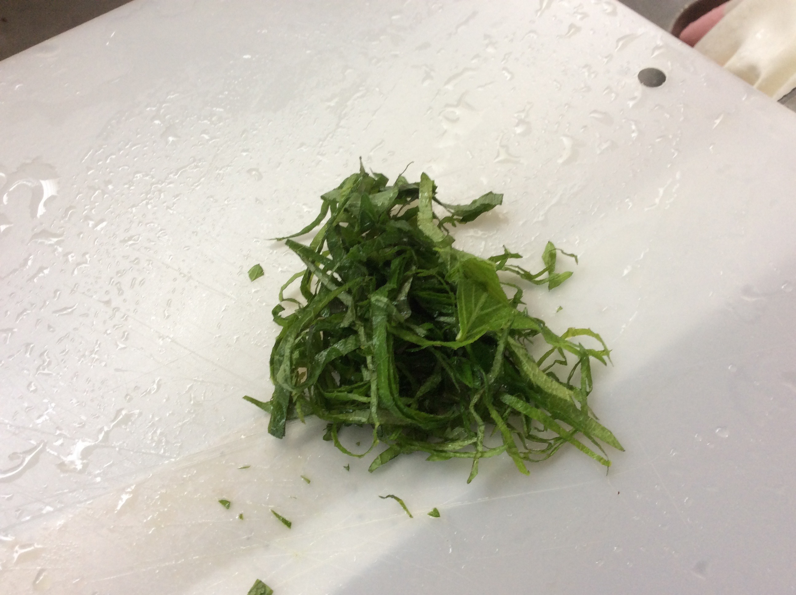 先に煮切って冷ましておいた汁に、すりおろしとろろ、葉わさびを入れます。