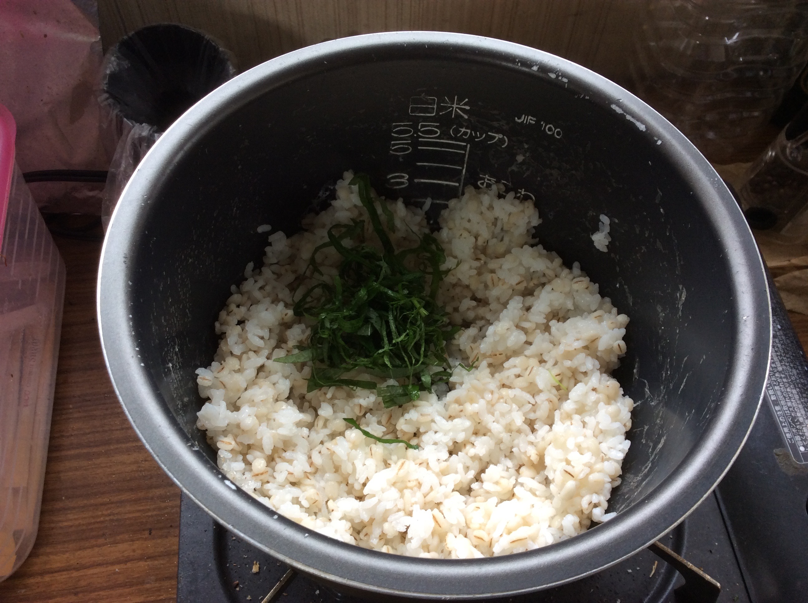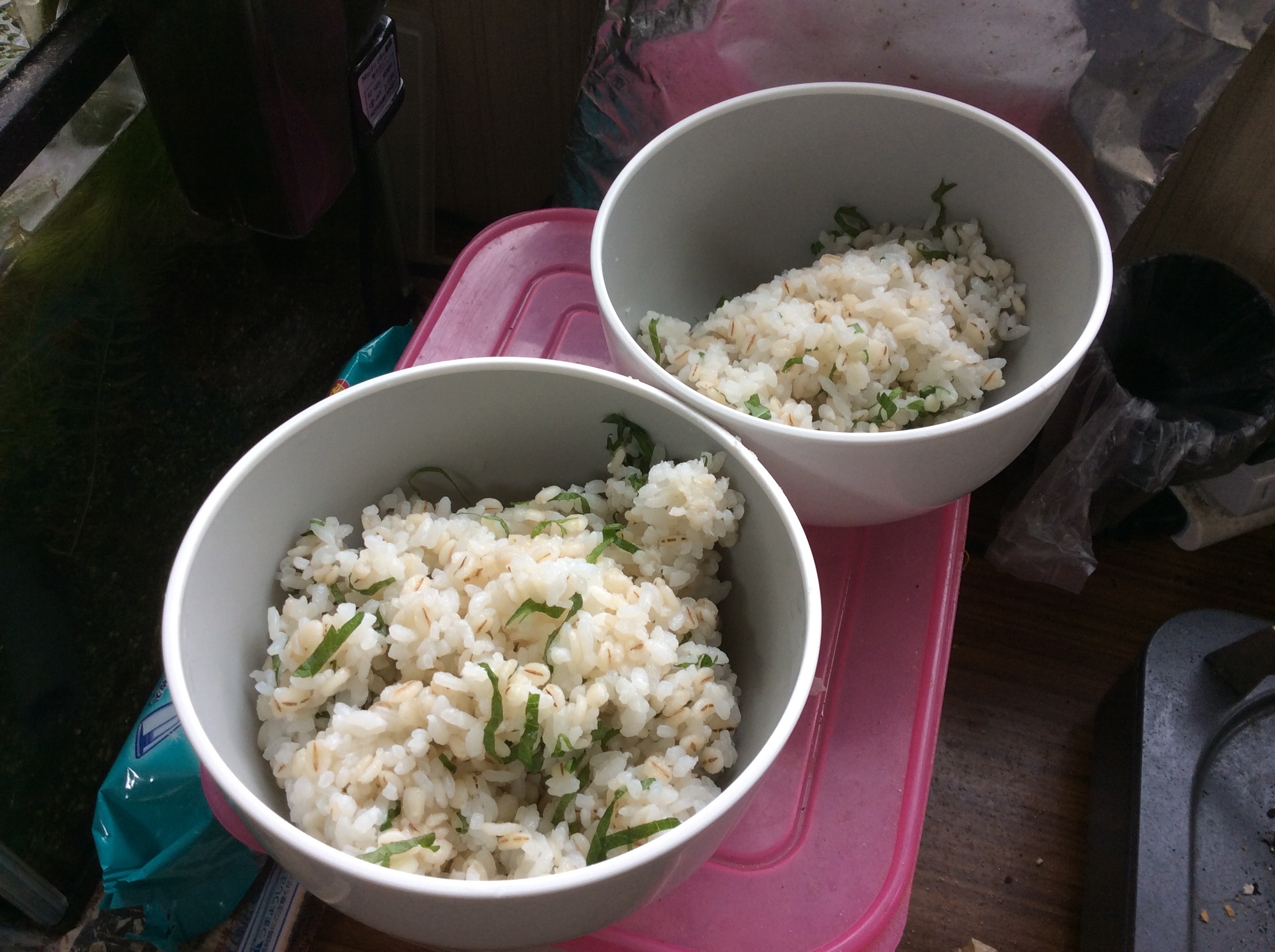 千切りシソは、季節がいいので放置できた残り麦飯にまぜまぜします。