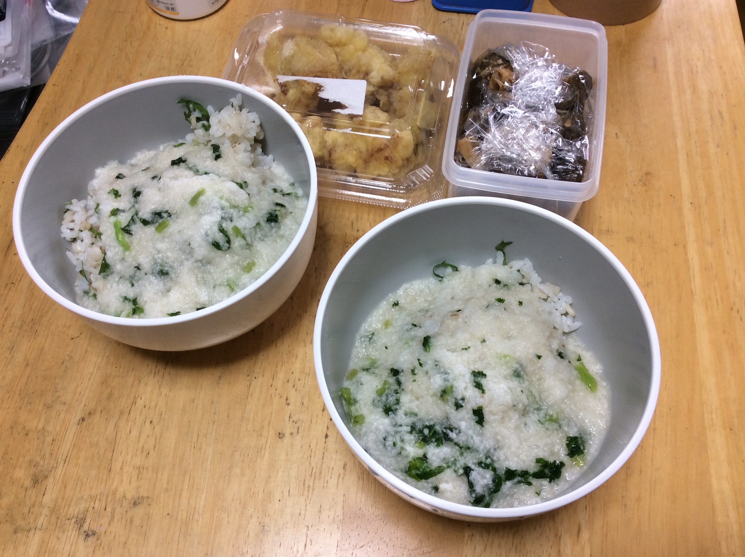 近所のスーパーで買ってきた鶏天と先日の残りのナスと椎茸と鶏肉の甘酢っぽいを