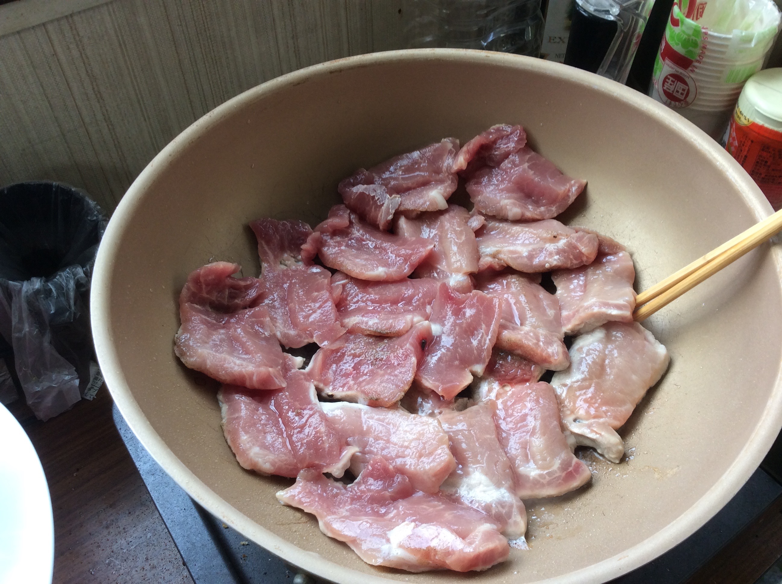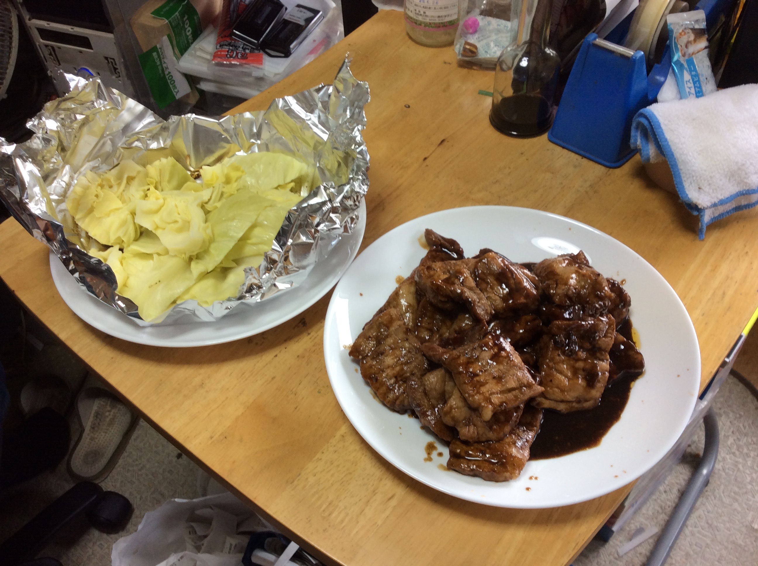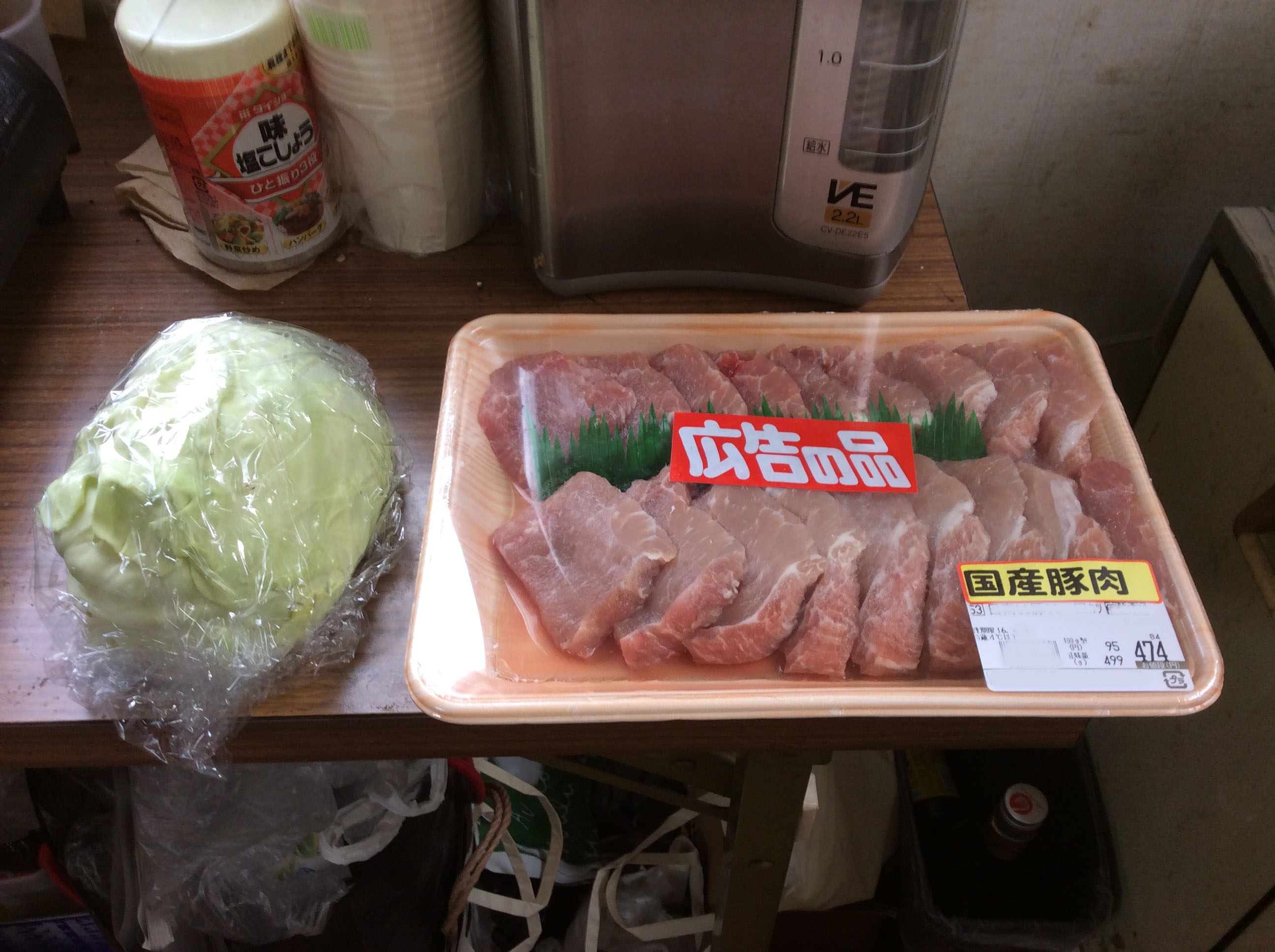 近所のスーパーで買った豚肉と冷蔵庫にいつから入ってたか忘れたキャベツ。