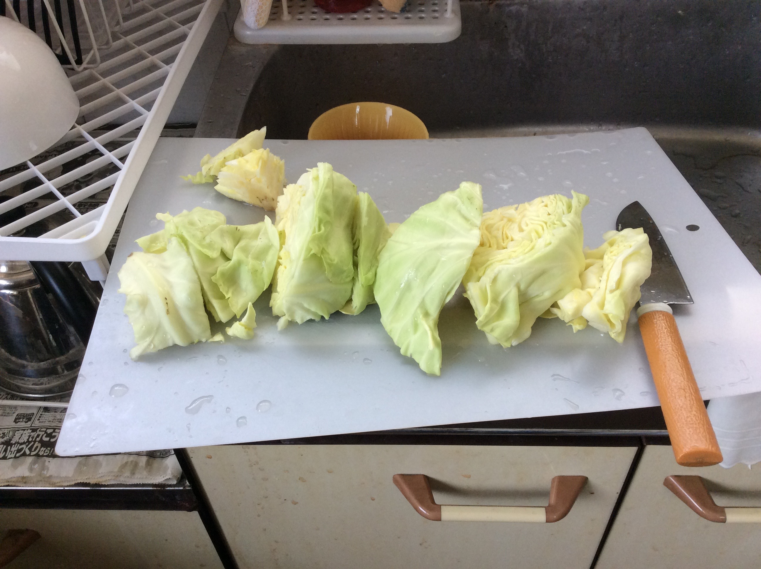 キャベツは推察しなくてもかなり古いので生食には向きません。ザクッと切って蒸します。