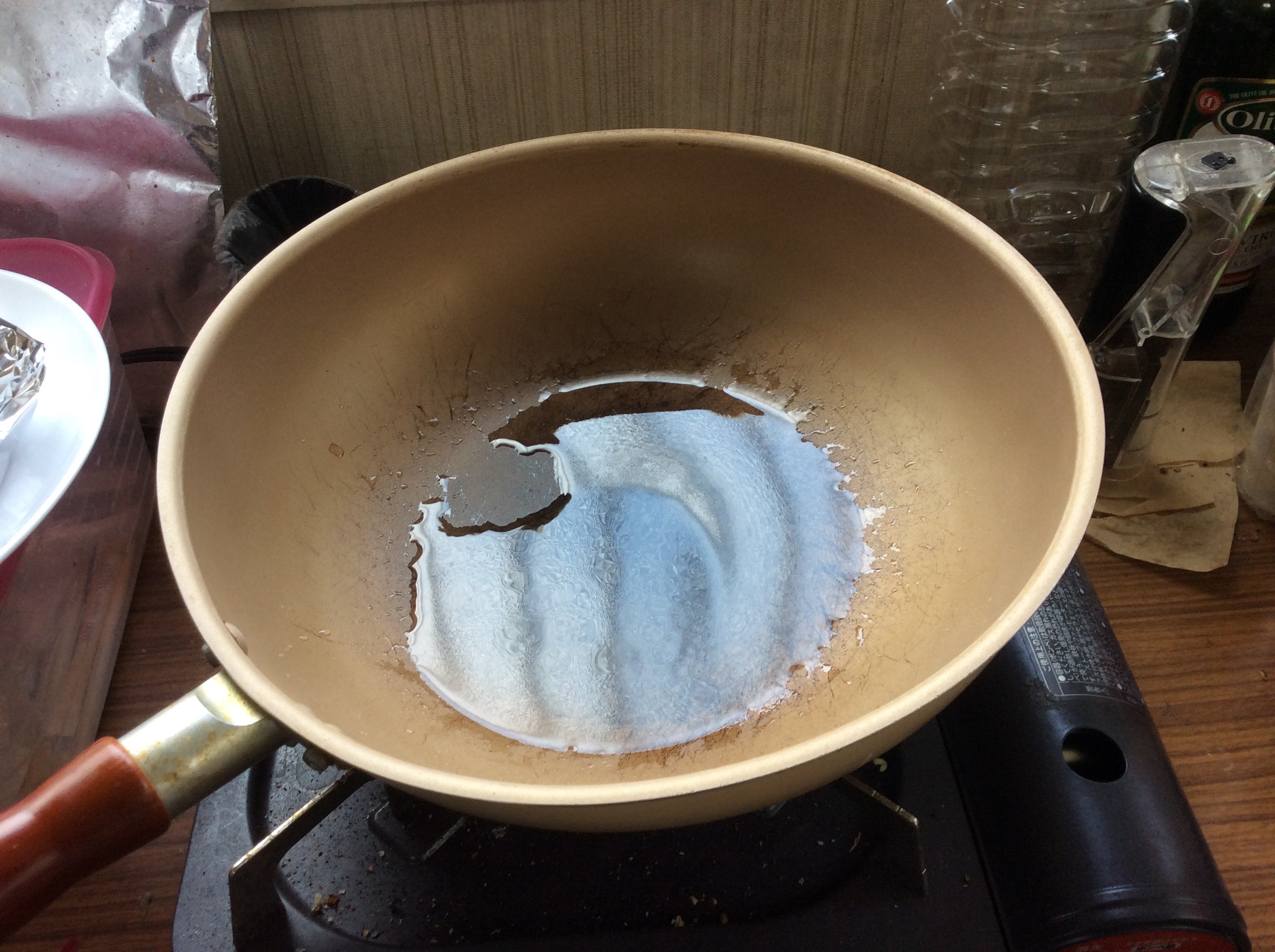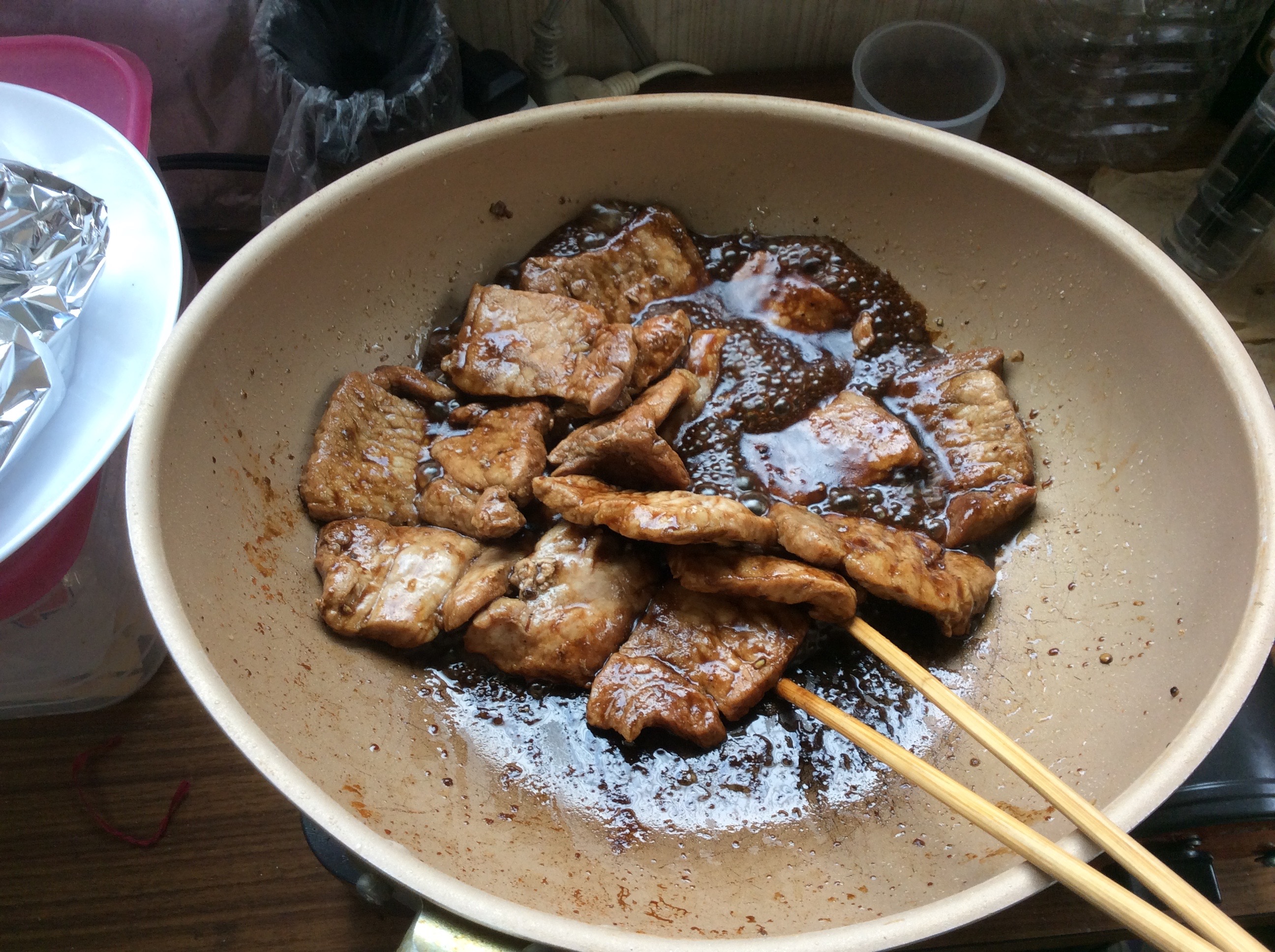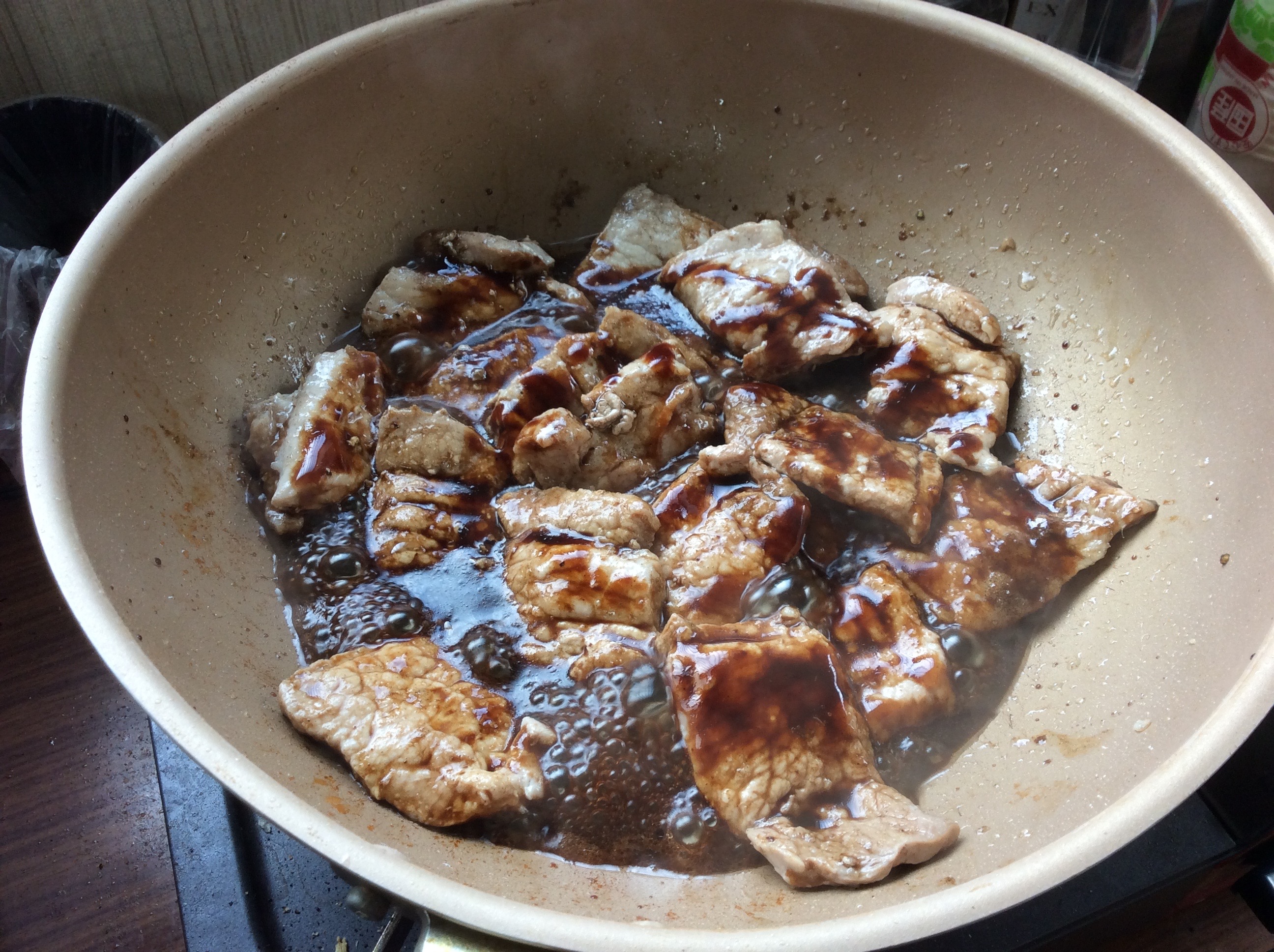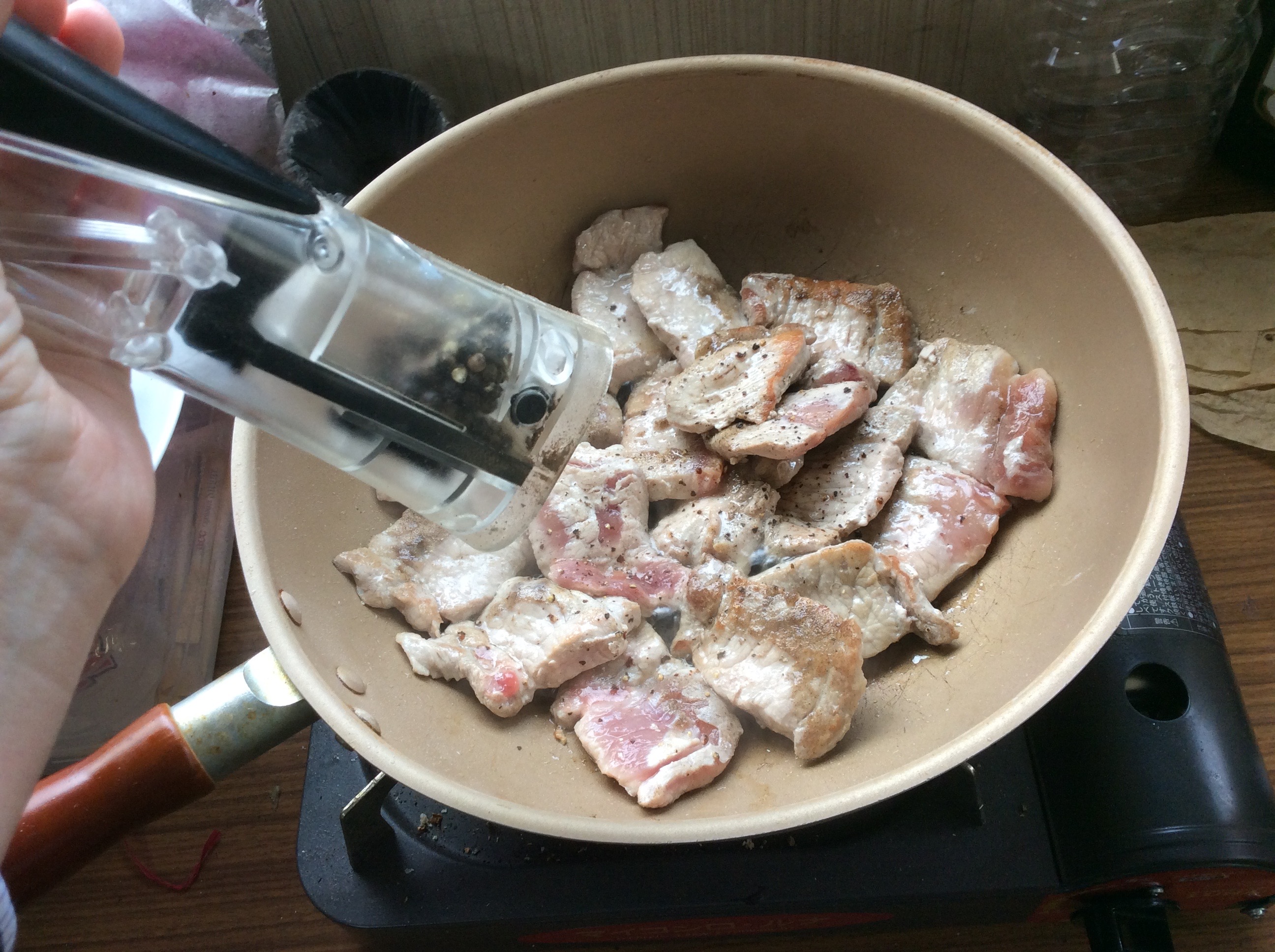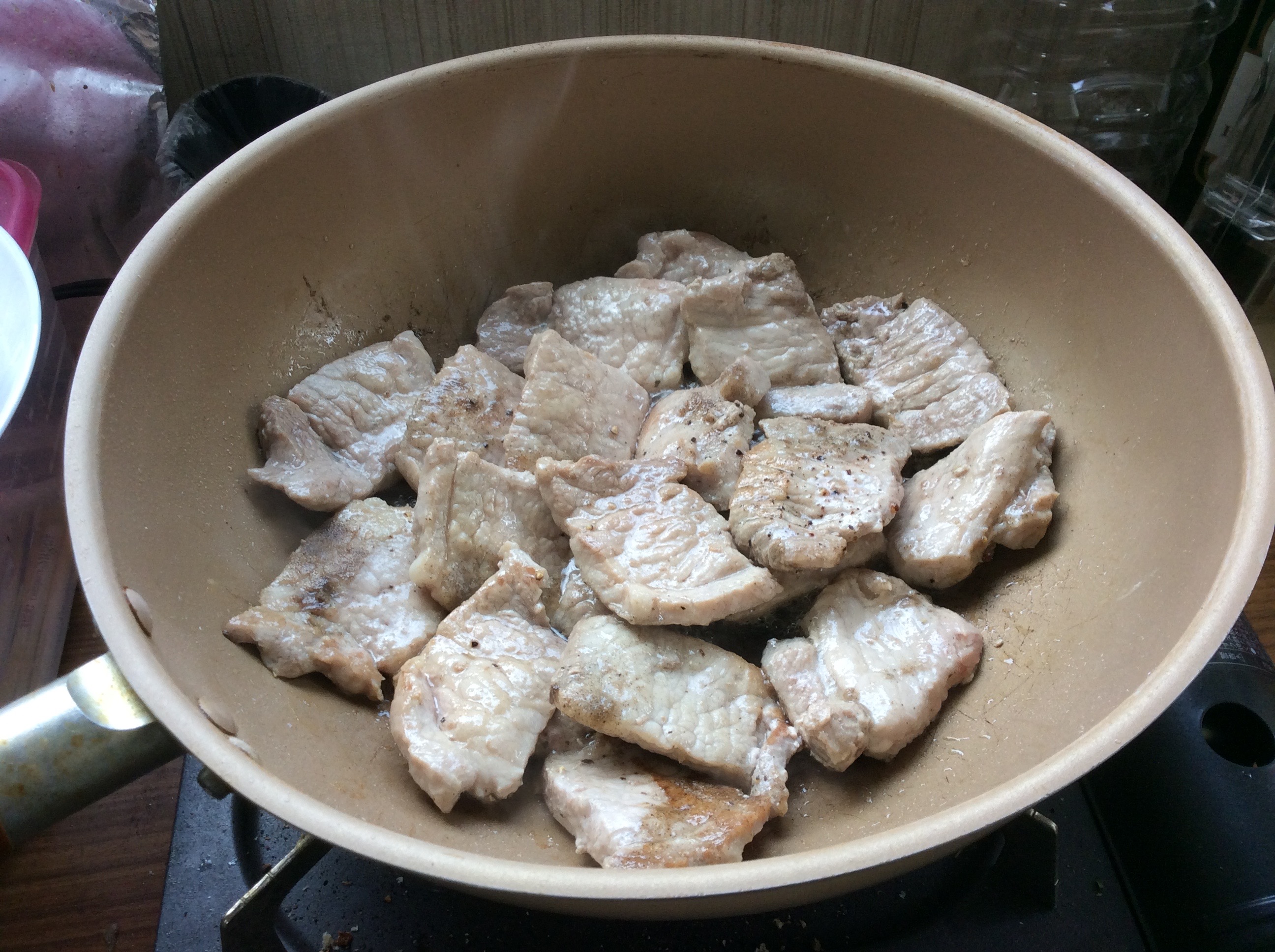 キャベツを蒸し終わったら、フライパンに油を入れて豚肉を投入。
