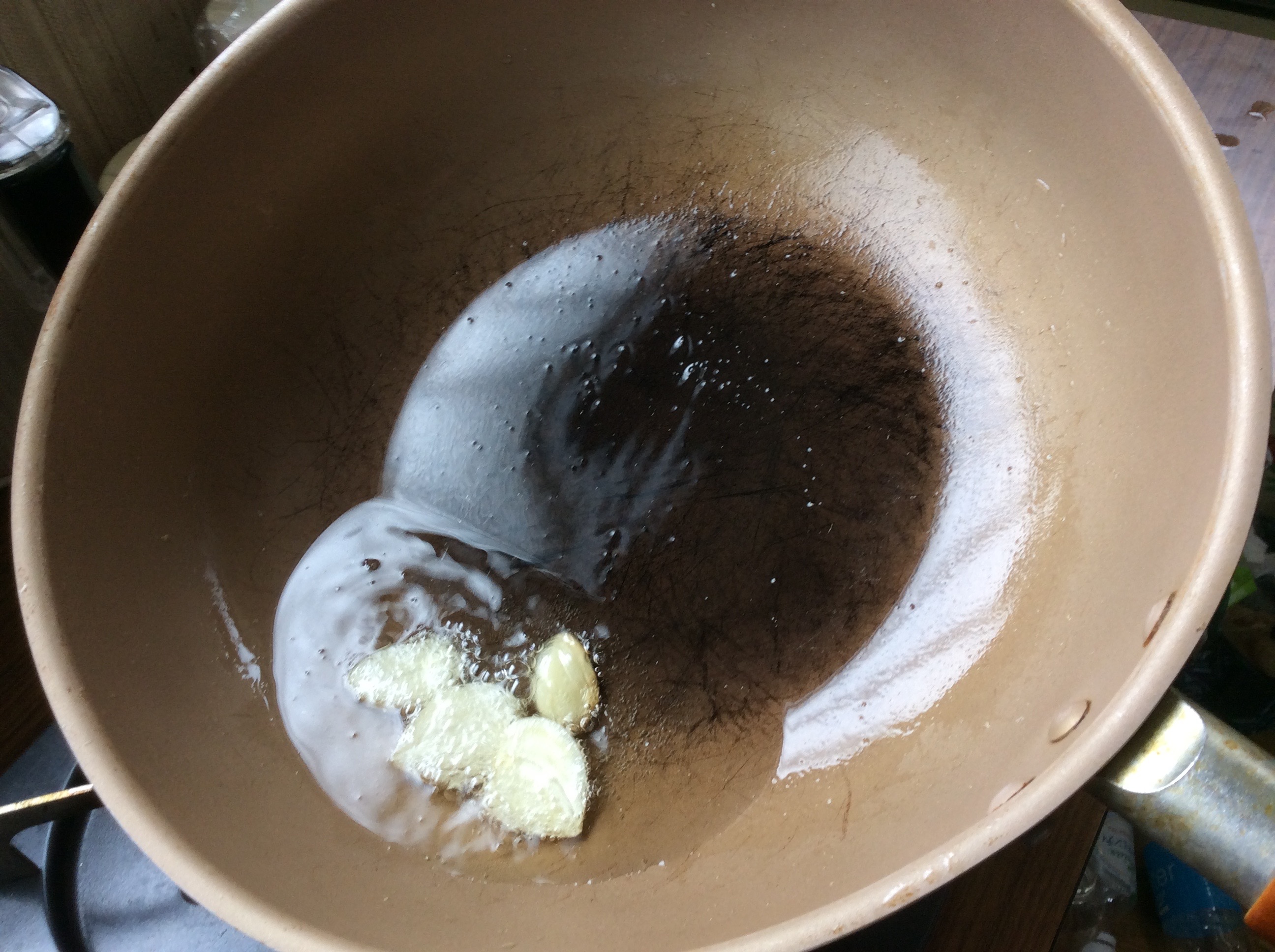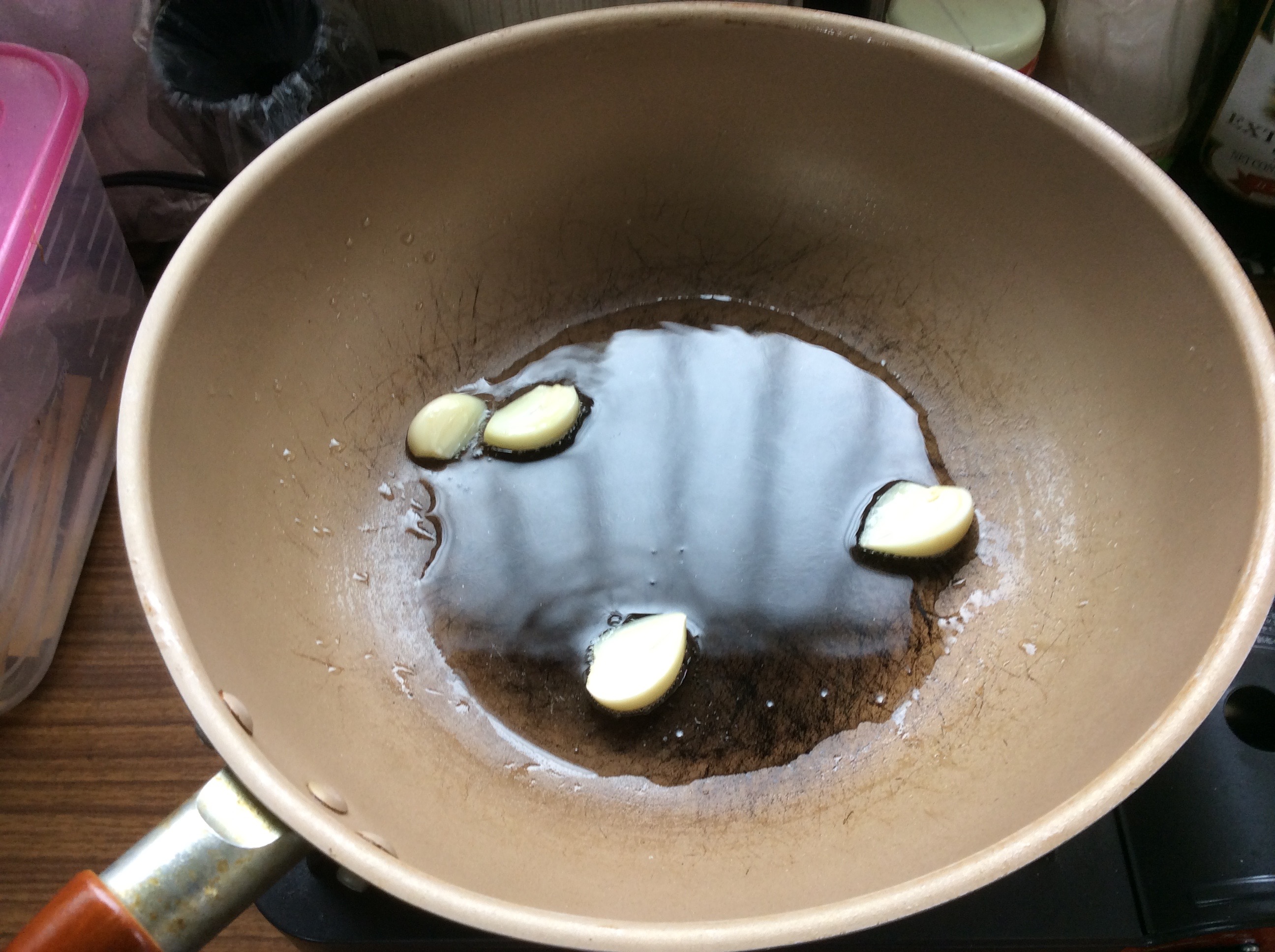 ニンニクが香ばしくなるまでゆっくりと油で熱する。