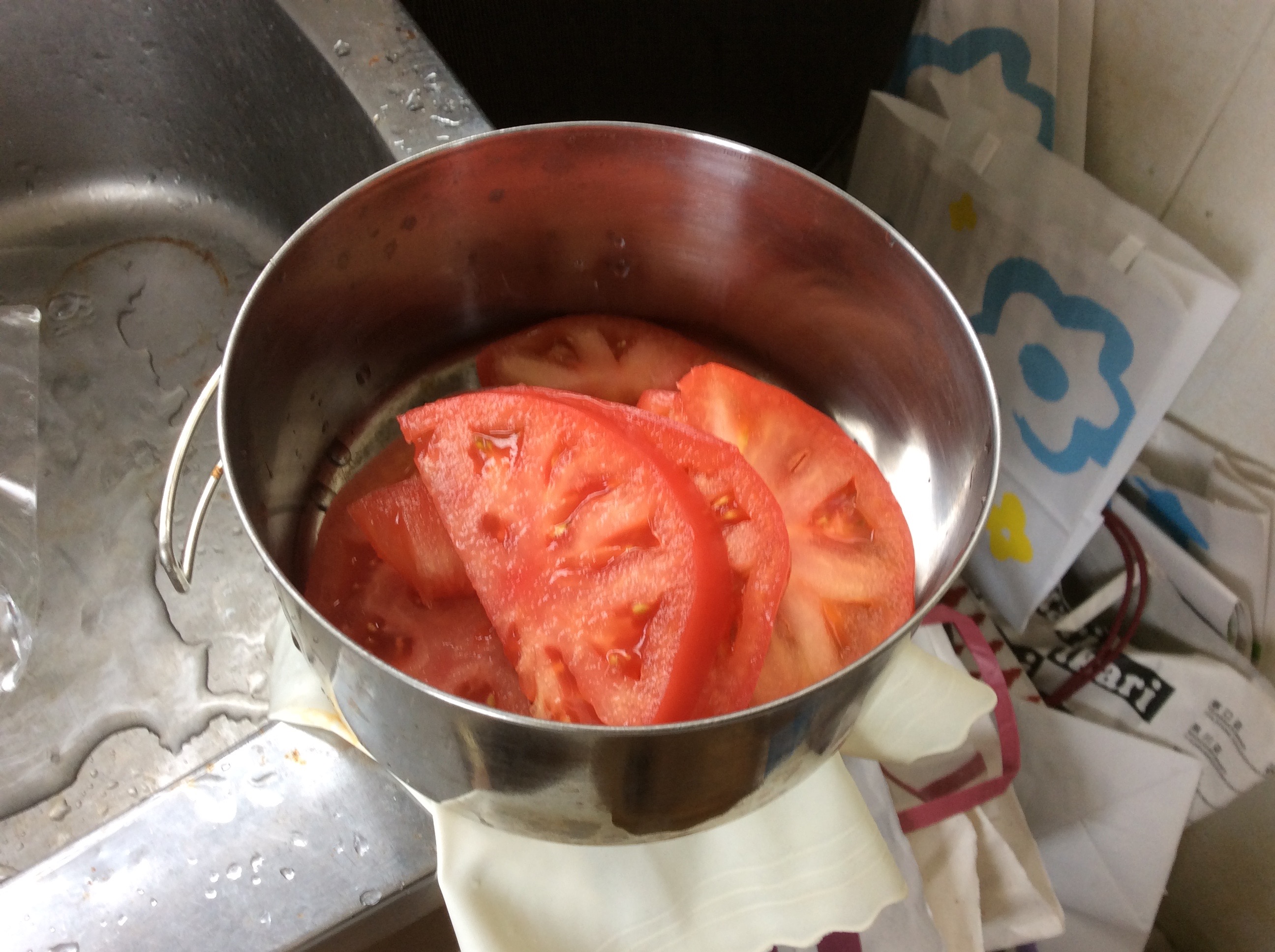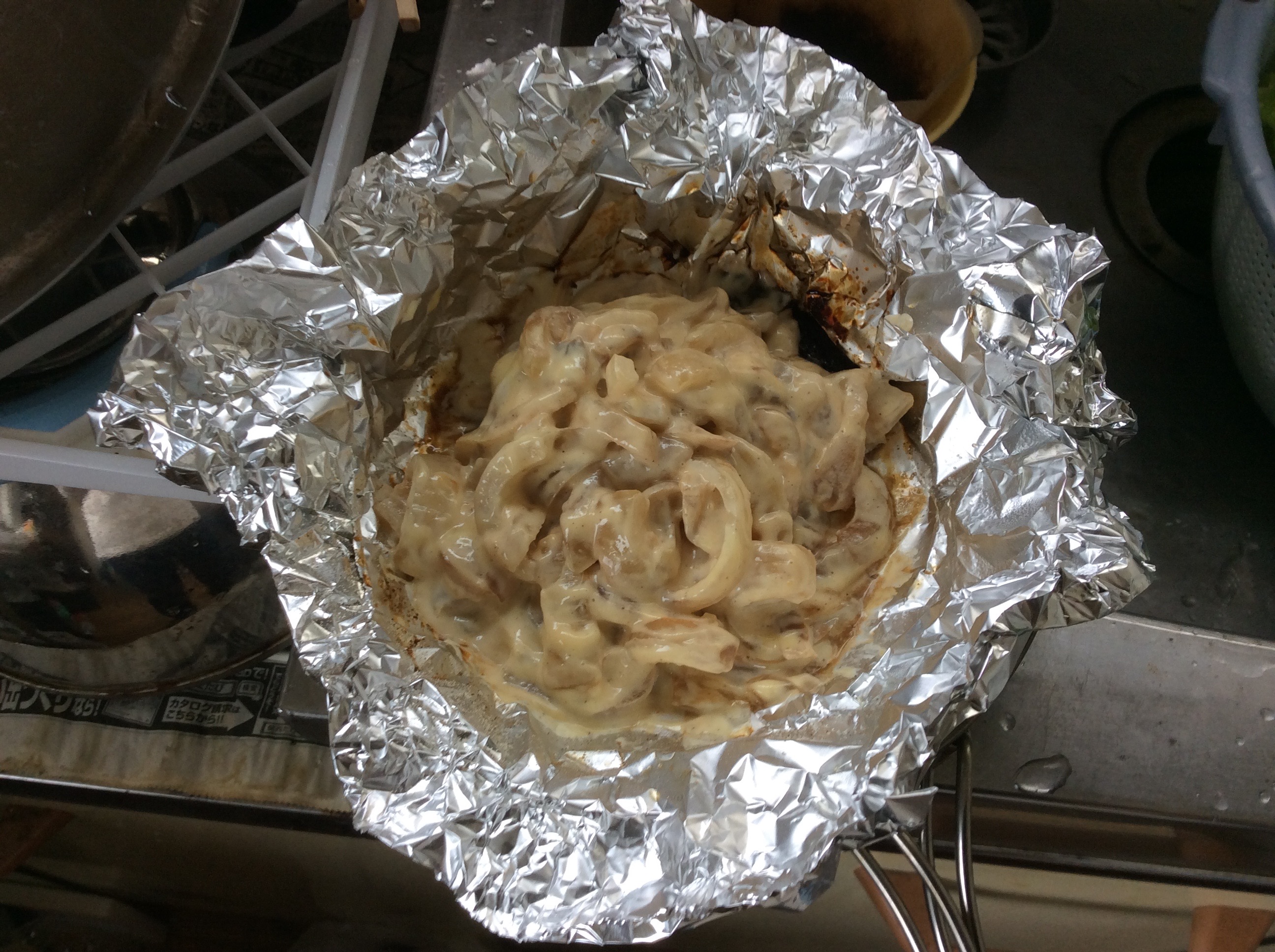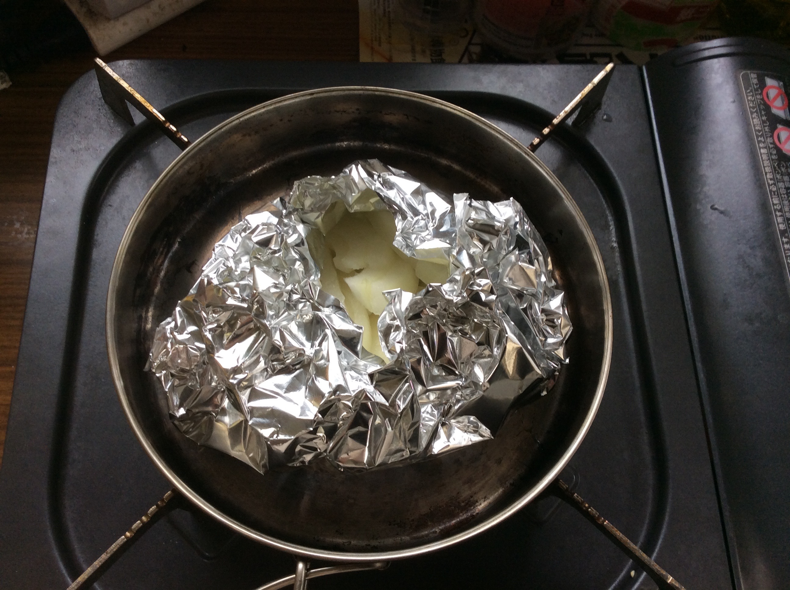 ナマ食は怖いので薄切りにしてアルミホイルに包み、キャンプクッカーで加熱する。