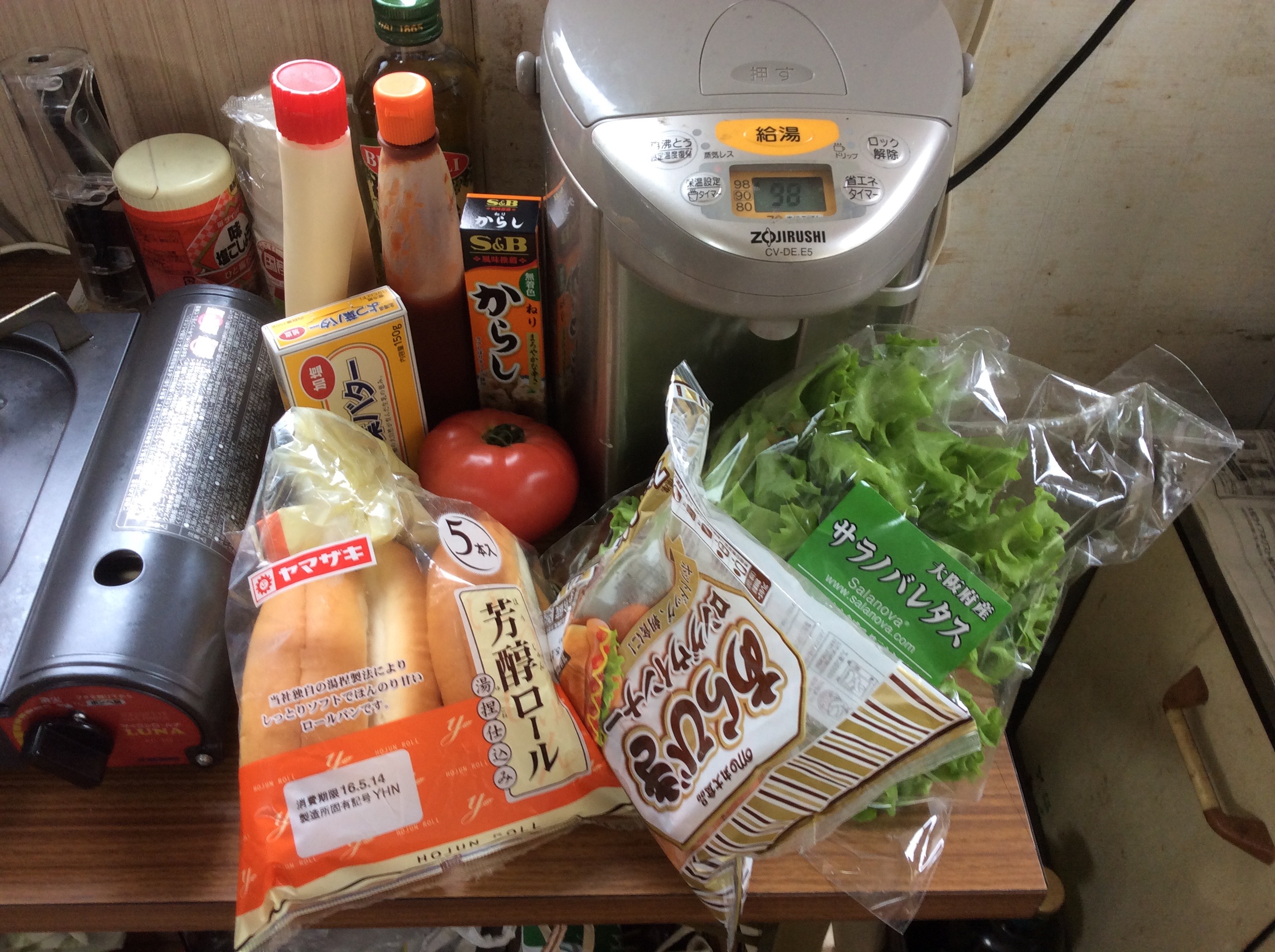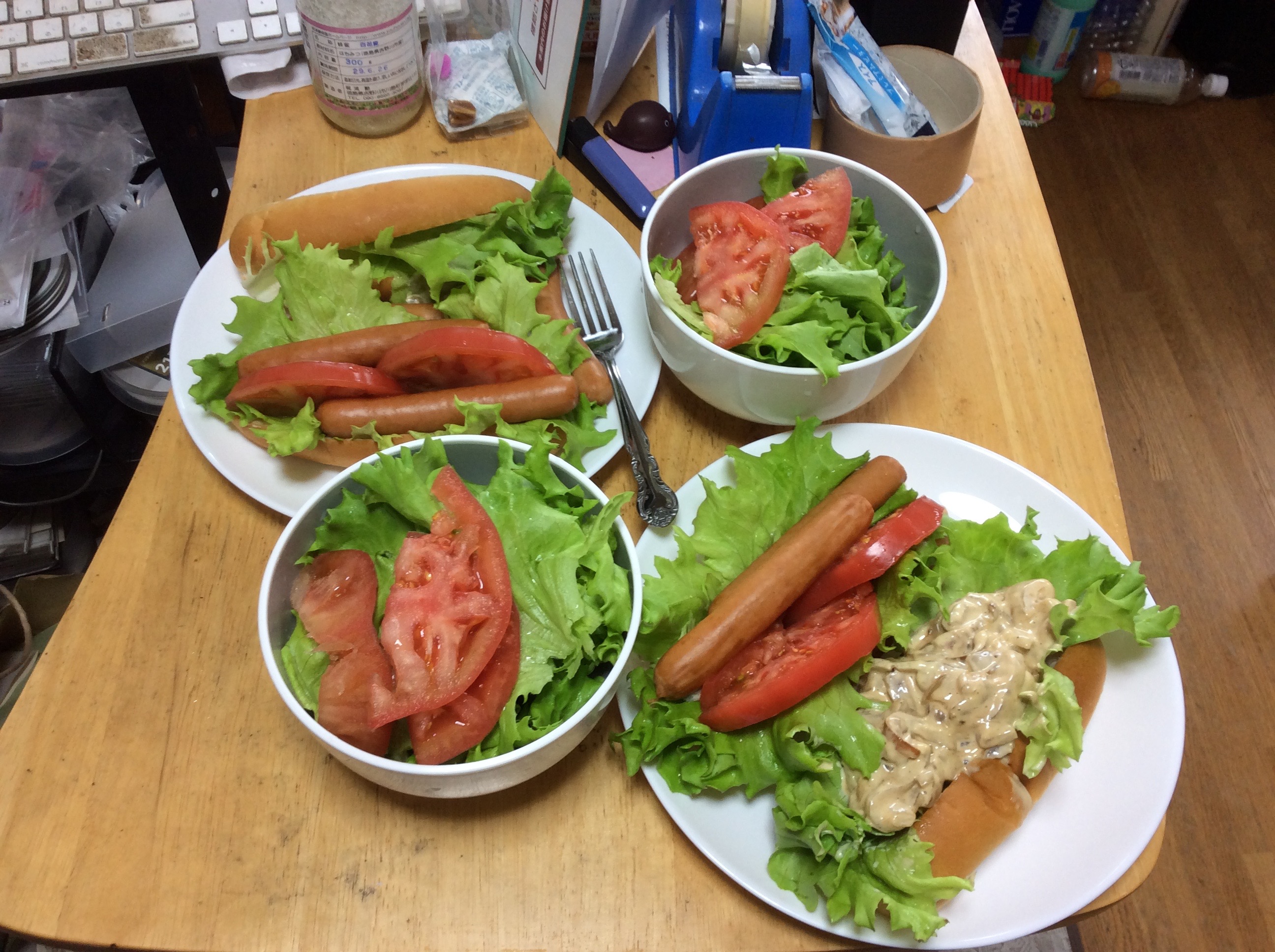 ウィンナーが茹ったら、玉ねぎカラシマヨ和え、トマト、レタスをパンに思い切りよく挟む。