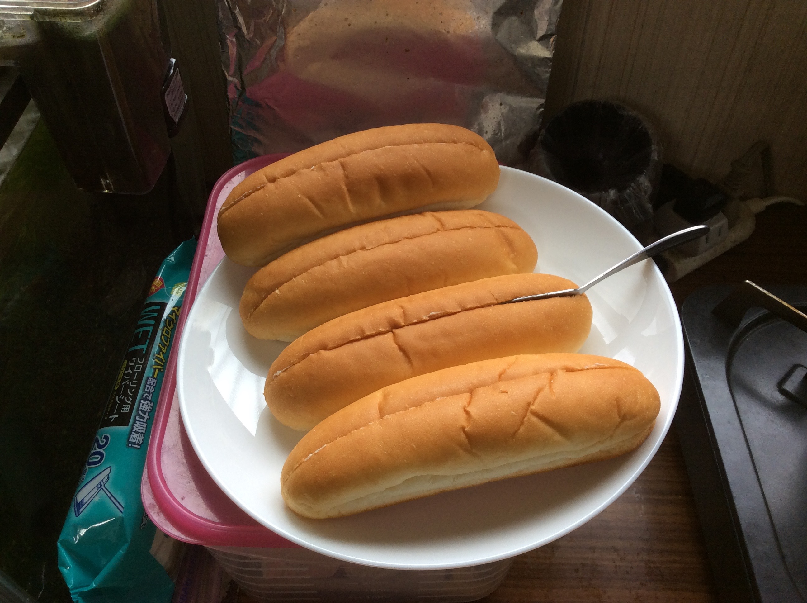 パンにバターを塗る。その間にウィンナーを茹でておく。